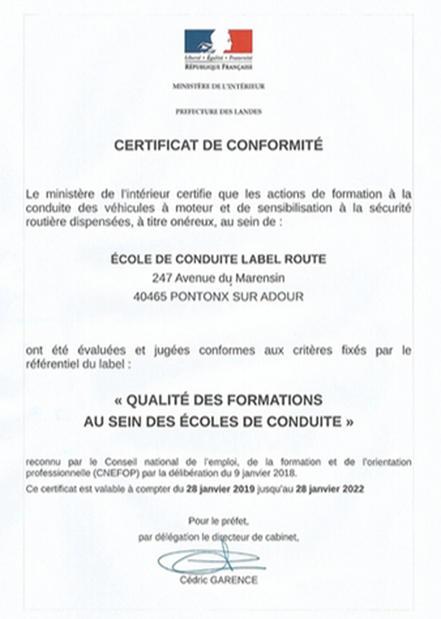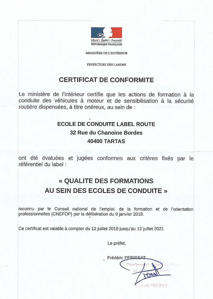 Label Route est la deuxième auto-école des Landes à avoir été labellisée par la préfecture.