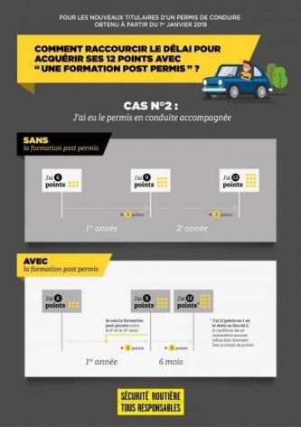 La durée de la formation est de 7h sur une même journée, il n’est ouvert qu’à ceux qui ont eu leur permis depuis le 1er janvier 2019 pour un premier permis (même un permis moto), entre les 6 mois et 1 an après la date d’obtention du permis (attention pour les conduite accompagnée qui ont passé leur permis avant leurs 18 ans, la date d’obtention du permis correspond à leurs 18 ans et non à la date de l’examen). Condition supplémentaire : ils ne doivent pas avoir perdu de points.
